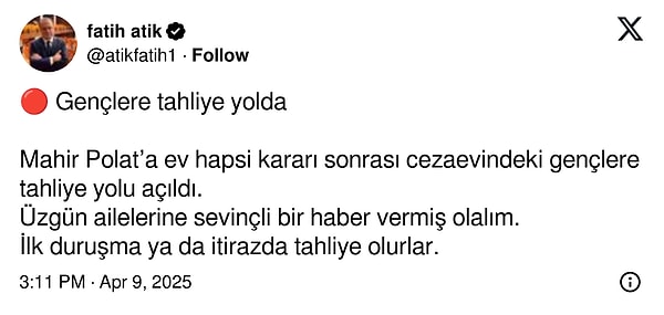 Gazeteci Fatih Atik, geçtiğimiz dakikalarda Uzman Polat için çıkan konut mahpusu kararının akabinde tutuklu gençler için hoş haberlerin de yolda olduğunu duyurdu.