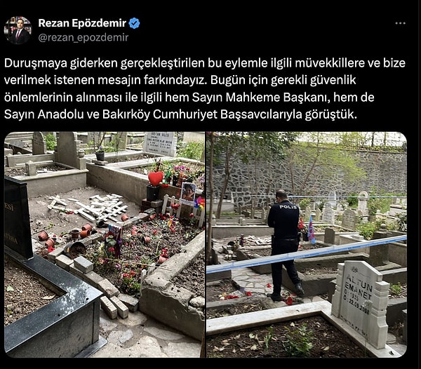 Ailenin avukatı Rezan Epözdemir, duruşma sabahı yaşanan mezar tahribatına dikkat çekti.