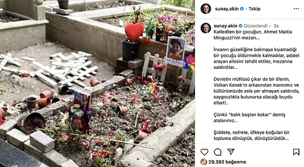“Katledilen bir çocuğun mezarı. İnsanın hoşluğuna bakmaya kıyamadığı bir çocuğu öldürmekle kalmadılar. Adalet arayan ailesini tehdit ettiler, mezarına saldırdılar. Devletin müftüsü çıkar da bir ölenin Volkan Konak’ın gerisinden inancımız ve kültürümüzde asla yer almayan taarruzda saygısızlıkta bulunursa olacağı buydu şüphesiz. Zira balık baştan kokar demiş cetlerimiz. Şiddete, nefrete, öfkeye boğulan bir topluma dönüştük, dönüştürüldük.”