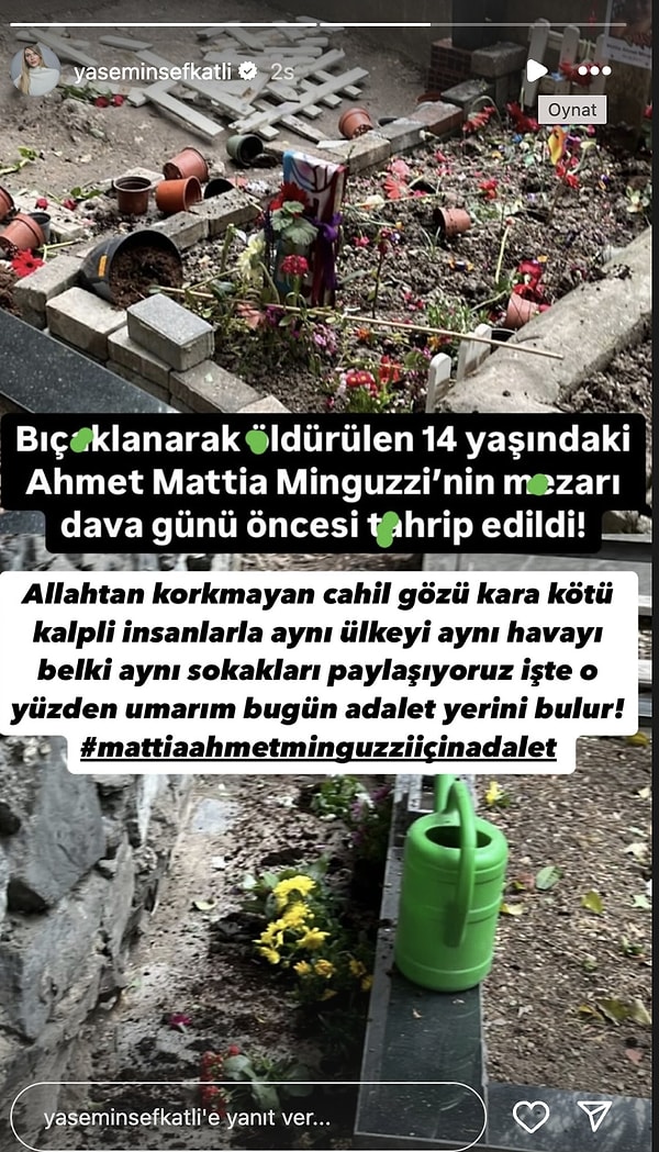 İtalyan şef Andrea Minguzzi’nin 15 yaşındaki oğlu Mattia Ahmet Minguzzi’nin öldürülmesine ait davada birinci duruşma bugün görüldü. Fakat duruşma öncesi yaşanan mezar saldırısı herkesi dehşete düşürdü. Ailenin avukatı Rezan Epözdemir, taarruzun bir gözdağı olduğunu belirtti. Anadolu Cumhuriyet Başsavcılığı, tahribatla ilgili soruşturma başlattı.