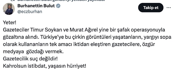 ‘Yeter!Gazeteciler Timur Soykan ve Murat Ağırel tekrar bir şafak operasyonuyla gözaltına alındı. Türkiye’ye bu berbat manzaraları yaşatanların, yargıyı sopa olarak kullananların tek hedefi iktidarı eleştiren gazetecilere, özgür medyaya gözdağı vermek. Gazetecilik hata değildir!Kahrolsun istibdat, yaşasın hürriyet!’