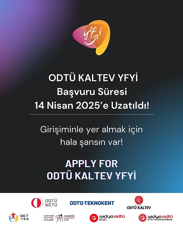 2005 yılından bu yana ODTÜ ve ODTÜ TEKNOKENT tarafından düzenlenen Türkiye’nin birinci erken etap hızlandırma programı Yeni Fikirler Yeni İşler (YFYİ), bu yıl ODTÜ’nün 63 yıllık araştırma geliştirme birikimini adaya taşıyan ODTÜ Kalkanlı Teknoloji Vadisi (KALTEV) iş birliği ile ODTÜ Kuzey Kıbrıs Yerleşkesi’nde gerçekleştirilecek.