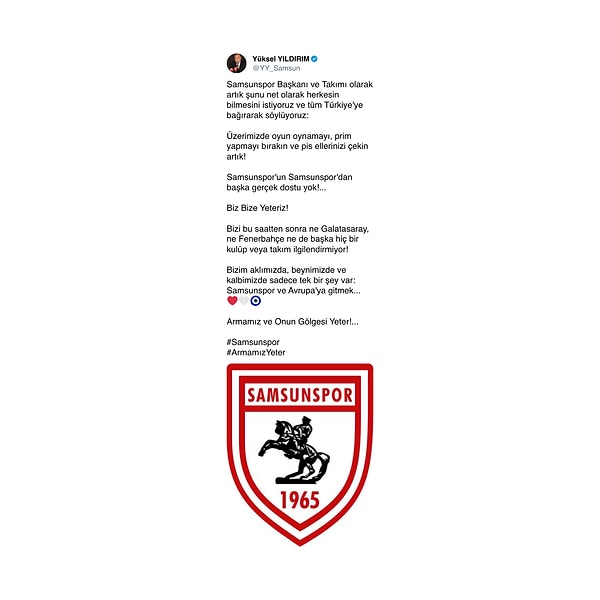 ‘Samsunspor Başkanı ve Takımı olarak artık şunu net olarak herkesin bilmesini istiyoruz ve tüm Türkiye’ye bağırarak söylüyoruz: