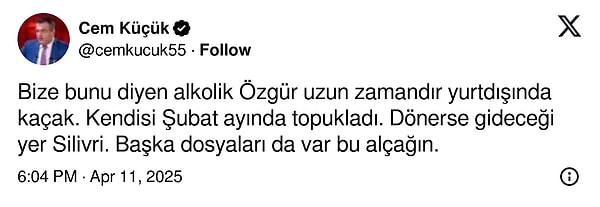 ‘Bize bunu diyen alkolik Özgür uzun vakittir yurtdışında kaçak. Kendisi Şubat ayında topukladı. Dönerse gideceği yer Silivri. Diğer belgeleri da var bu alçağın.’