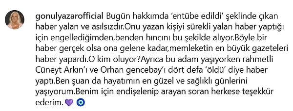‘Bugün hakkımda ‘entübe edildi’ halinde çıkan haber palavra ve asılsızdır. Onu yazan kişiyi daima palavra haber yaptığı için engellediğimden, benden hıncını bu biçimde alıyor. Bu türlü bir haber gerçek olsa ona gelene kadar, memleketin en büyük gazeteleri haber yapardı. O kim oluyor? Ayrıyeten bu adam yaşıyorken merhum Cüneyt Arkın’ı ve Orhan Gencebay’ı dört kere ‘öldü’ diye haber yaptı. Ben şuan da hayatımın en hoş ve sağlıklı günlerini yaşıyorum. Benim için endişelenip arayan soran herkese teşekkür ederim.💜🧿’