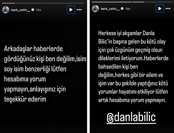 ‘Arkadaşlar haberlerde gördüğünüz kişi ben değilim. İsim soy isim benzerliği lütfen hesabıma yorum yapmayın. Anlayışınız için teşekkür ederim. Herkese düzgün akşamlar, Danla Bilic’in başına gelen bu berbat olay için çok üzgünüm, geçmiş olsun dileklerimi iletiyorum. Haberlerde bahsedilen kişi ben değilim. Herkes üzere bir ailem ve işim var bu halde yaptığınız berbat yorumlar hayatımı etkiliyor. Lütfen artık hesabıma yorum yapmayın’ sözlerini kullanan futbolcu Berk Çetin ortada bir karışıklık olduğunu lisana getirdi.