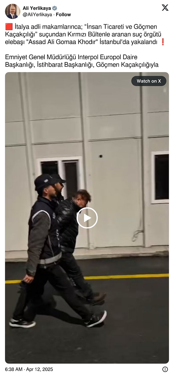 ‘İtalya isimli makamlarınca; “İnsan Ticareti ve Göçmen Kaçakçılığı” cürmünden Kırmızı Bültenle aranan cürüm örgütü elebaşı ‘Assad Ali Gomaa Khodır’ İstanbul’da yakalandı.