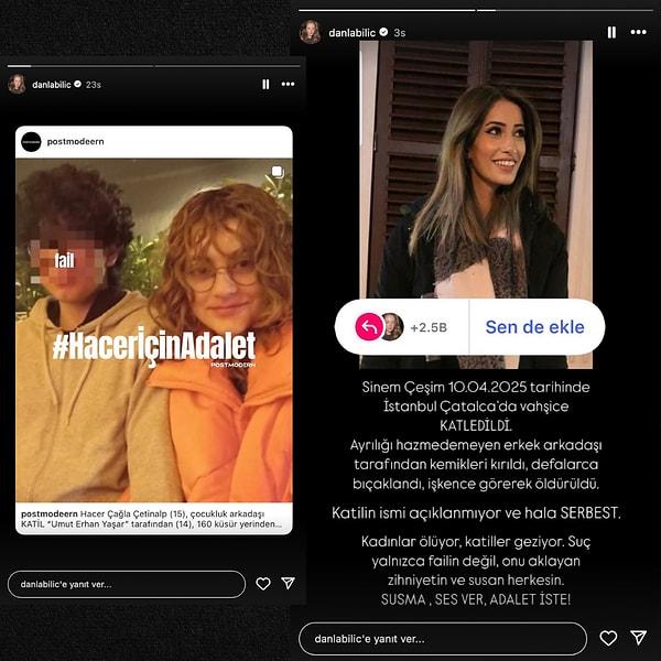 ‘Türkiye’de yaşayan her bayan üzere, bir story ile sesini duyuramayan bayanlar üzere çözmeye çalıştım. Direndim olmadı’ açıklamasında bulunan Danla Bilic, kendisine reaksiyon gösteren kullanıcılara seslendi ve geç kaldığı her bayan çığlığı için özür diledi.