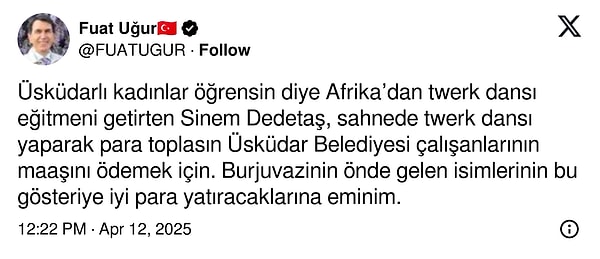 Uğur paylaşımında, “Üsküdarlı bayanlar öğrensin diye Afrika’dan twerk dansı eğitmeni getirten Sinem Dedetaş, sahnede twerk dansı yaparak para toplasın Üsküdar Belediyesi çalışanlarının maaşını ödemek için. Burjuvazinin önde gelen isimlerinin bu şova güzel para yatıracaklarına eminim.” sözlerini kullandı.