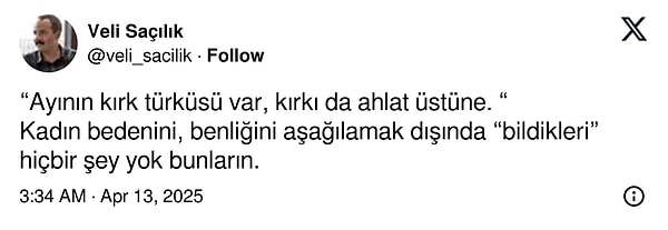 Ayının kırk türküsü var, kırkı da ahlat üstüne. Bayan vücudunu, benliğini aşağılamak dışında “bildikleri” hiçbir şey yok bunların.’