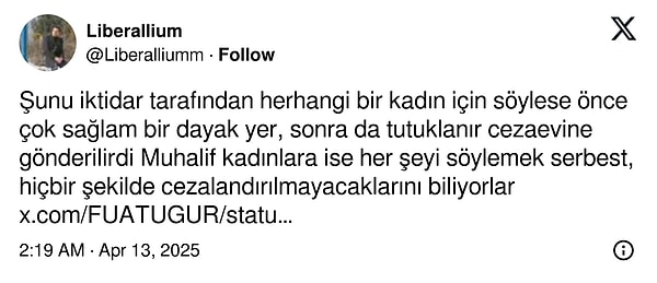 Şunu iktidar tarafından rastgele bir bayan için söylese evvel çok sağlam bir dayak yer, sonra da tutuklanır cezaevine gönderilirdi Muhalif bayanlara ise her şeyi söylemek özgür, hiçbir formda cezalandırılmayacaklarını biliyorlar