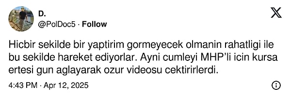 ‘Hiçbir biçimde bir yaptırım görmeyecek olmanın rahatlığı ile bu halde hareket ediyorlar. Tıpkı cümleyi MHP’li için kursa sonraki gün ağlayarak özür görüntüsü çektirirlerdi.’