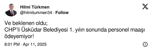 Paylaşım sonrasında ise eski Üsküdar Belediye Başkanı Hilmi Türkmen ekonomik zorluk yaşadığını argüman ettiği belediyenin emekçi maaşlarını ödemeyecek seviyeye geldiğini tez etmişti.
