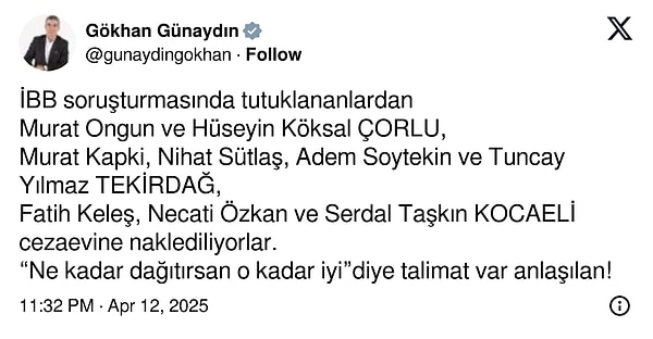 ‘İBB soruşturmasında tutuklananlardan, Murat Ongun ve Hüseyin Köksal Çorlu, Murat Kapki, Nihat Sütlaş, Adem Soytekin ve Tuncay Yılmaz Tekirdağ,Fatih Keleş, Necati Özkan ve Serdal Taşkın Kocaeli cezaevine naklediliyorlar.’Ne kadar dağıtırsan o kadar iyi’ diye talimat var anlaşılan!’