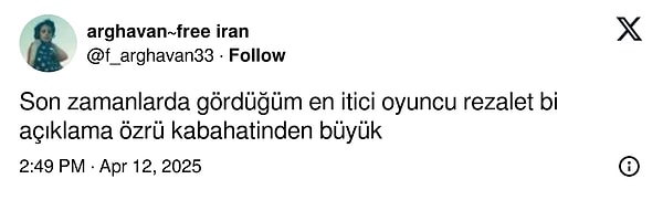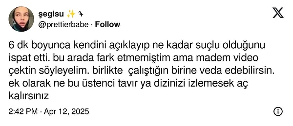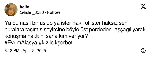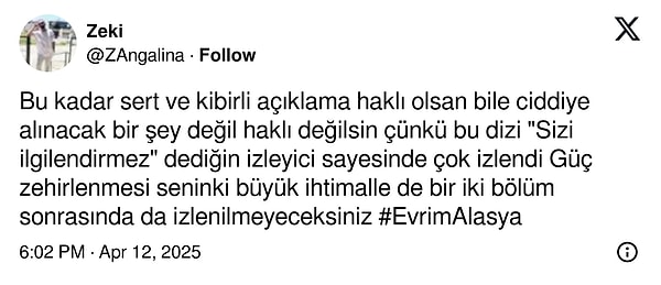 Bir diğer kullanıcı, “Bu kadar üstenci bir görüntü çekilmez, izleyiciye doruktan bakamazsın” yorumunu yaptı. Hatta kimi izleyiciler, “En itici oyuncu ilan ediyorum” ve “Özürü kabahatinden büyük” üzere yorumlarla Alasya’yı yerden yere vurdu.