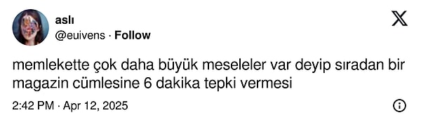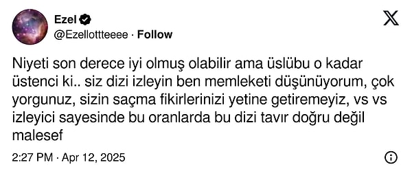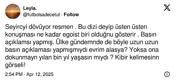 “Bu bir dizi, memleket problemi değil. Sadece bir dizi.” diyerek de reaksiyonlara hayli sert bir cevap verdi. “İşimi gücümü bırakıp size kendimi anlatmak zorunda kalıyorum. Orada olan biten yalnızca bizi ilgilendirir. Burada sizi ilgilendiren hiçbir şey yok. Öbürü paylaşmadı bir şey diye ‘onunla küs’ diye bir şey yoktur.” diyerek sesini yükseltti.