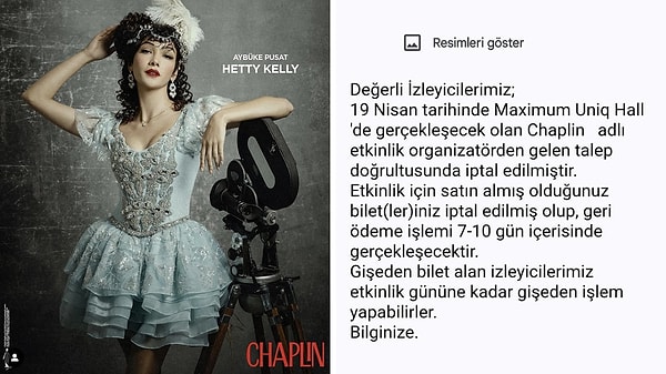 Bu kere de Aybüke Pusat’ın rol aldığı tiyatro oyunu Chaplin ile ilgili yaşanan bir gelişme gündeme bomba üzere düştü. Uzun vakittir sahnelenen ve ilgiyle takip edilen oyunun 19 Nisan’da Maximum Uniq’de gerçekleşmesi planlanan gösterimi tertip tarafından ansızın iptal edildi.