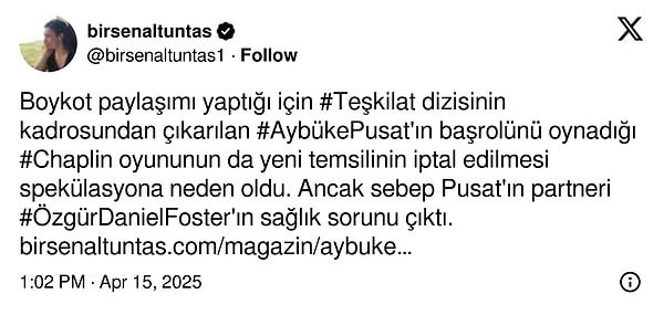 Teşkilat dizisinden çıkarılmasıyla gündeme gelen Aybüke Pusat’ın bu sefer tiyatro sahnesiyle ilgili gelişmeler konuşuluyor. “Chaplin” isimli tiyatro oyununun iptal edilmesi sonrası tekrar gündeme oturan Pusat’a takviye bildirileri yağdı.