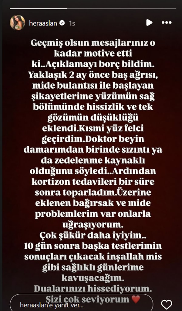 Fakat kendisinin bugün gündemimizde olmasının sebebi farklı. Hera Aslan, geçtiğimiz saatlerde toplumsal medya hesabından yüz felci geçirdiğini açıkladı.