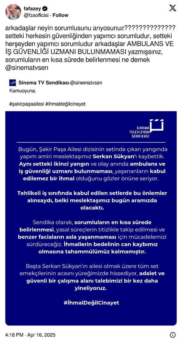Sinema TV Sendikası’nın ‘ihmal değil cinayet’ etiketiyle yaptığı ve ‘Sendika olarak sorumluların en kısa müddette belirlenmesi ve misal facianın bir daha asla yaşanmaması uğraşımızı sürdüreceğiz’ vurgulu paylaşımına karşılık veren Farah Zeynep Abdullah, yangının sorumlusu olarak üretimciyi gösterdi, Sinema TV sendikasının açıklamasına da sert bir çıkışta bulundu.