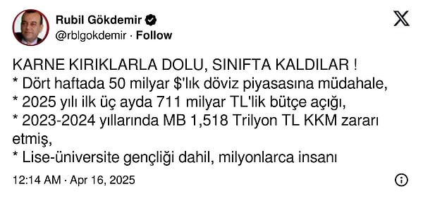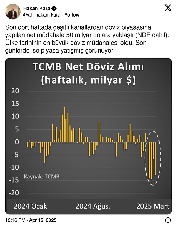 İstanbul Büyükşehir Belediye Başkanı Ekrem İmamoğlu’nun 19 Mart 2025 Çarşamba günü gözaltına alınmasının akabinde piyasalar da adeta sarsıntı olmuştu. Merkez Bankası’nın 19 Mart-21 Mart ortasında 25 milyar dolar döviz satışı gerçekleştirdiği ileri sürülmüştü. Dövize müdahalesi devam ediyor mu diye merak edilirken Merkez Bankası eski Başekonomisti Prof. Dr. Hakan Kara, X hesabından çarpıcı bir açıklama yaptı.