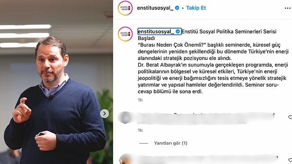 2015-2018 yılları ortasında Güç ve Tabii Kaynaklar Bakanı, 2018-2020 yılları arasında ise Hazine ve Maliye Bakanı olarak görev yapan Berat Albayrak en merak edilen isimlerden birisi. Uzun müddettir manzara vermeyen Albayrak, NUN Eğitim ve Kültür Vakfı’na bağlı Enstitü Toplumsal niyet kuruluşunda gerçekleşen seminerde ortaya çıktı. Kurum, Berat Albayrak’ın seminerden fotoğraflarını paylaştı.
