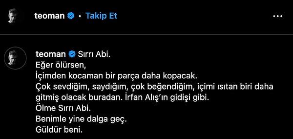 Geçirdiği rahatsızlık sonrasında hastaneye kaldırılan Sırrı Süreyya Lider, 12 saat süren ameliyat sonrasında ağır bakıma alındı. Hayati tehlikesi devam eden Sırrı Süreyya Önder’e müzikçi Teoman’dan dayanak iletisi geldi. Instagram hesabından paylaşım yapa Teoman, “Ölme Sırrı Abi. Benimle yeniden dalga geç. Güldür beni” dedi.