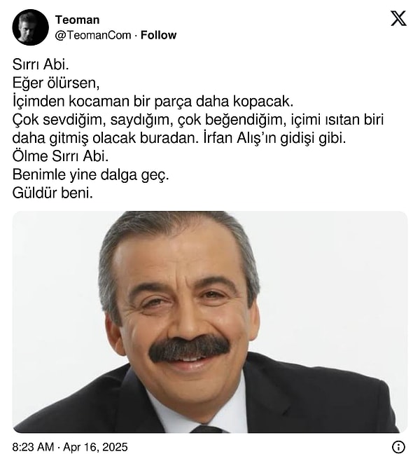 Şarkıcı Teoman, toplumsal medya hesabından Sırrı Süreyya Lider için yaptığı paylaşım da “Ölme Sırrı Abi” dedi.
