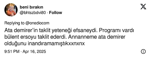 Aynı programda DEM Parti İstanbul Milletvekili Sırrı Süreyya Önder ve usta oyuncu Erkan Can’ın taklidini yapan isim kısa müddette toplumsal medyanın gündemine oturdu.