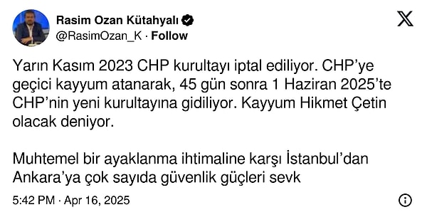 ‘Yarın Kasım 2023 CHP kurultayı iptal ediliyor. CHP’ye süreksiz kayyum atanarak, 45 gün sonra 1 Haziran 2025’te CHP’nin yeni kurultayına gidiliyor. Kayyum Hikmet Çetin olacak deniyor.