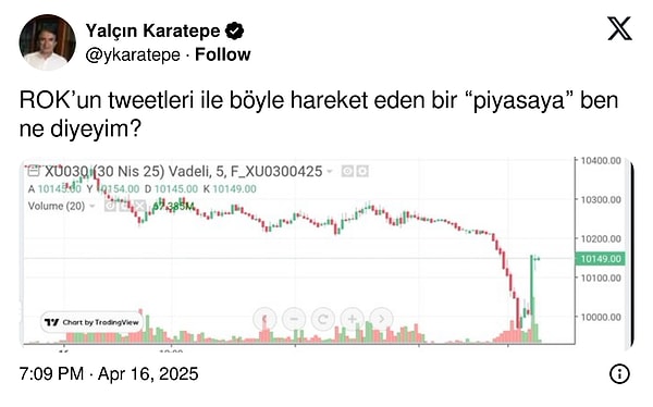 CHP Genel Lider Yardımcısı ve ekonomist Yalçın Karatepe X hesabından bir grafik paylaştı ve ‘ROK’un tweetleri ile bu türlü hareket eden bir ‘piyasaya’ ben ne diyeyim?’ notunu düştü.