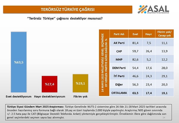 Asal Araştırma, 21-28 Mart 2025 tarihleri ortasında 2 bin şahısla bir anket düzenleyerek ‘Terörsüz Türkiye davetini destekliyor musunuz?’ sorusunu yöneltti.
