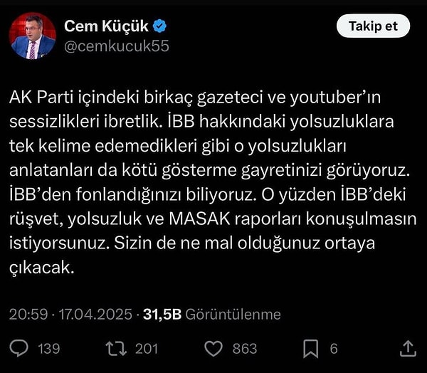 Sosyal medya hesabından paylaşım yapan Türkiye Gazetesi yazarı Cem Küçük, kimi AKP’li gazetecilere ve YouTuberlara sonlandı. Küçük paylaşımında, ”İBB’deki rüşvet, yolsuzluk ve MASAK raporları konuşulmasın istiyorsunuz. Sizin de ne mal olduğunuz ortaya çıkacak” diyerek reaksiyon gösterdi.