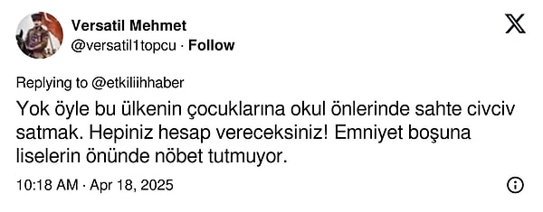 Haklarında süreç başlatılan şüpheliler karara isyan etti. Şüphelilerden birisi ‘Tek kabahatimiz civciv satmak. Uyuşturucu baronlarını yakalamıyorlar, civciv baronlarını yakalıyorlar. Civciv sattığımız için elimize kelepçe vurdular. Özgürlüğümüzü elimizden alıyorlar’ dedi.