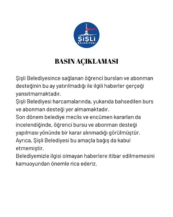 Kayyum atanan Şişli Belediyesi bahisle ilgili bir açıklama yayınladı.