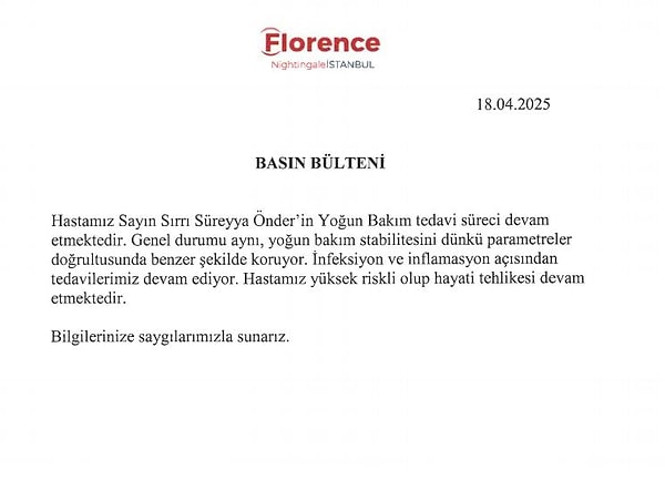 Kalp rahatsızlığı sebebiyle hastaneye kaldırılan TBMM Başkanvekili ve DEM Parti İstanbul Milletvekili Sırrı Süreyya Öncü’nün, geçirdiği ameliyat sonrası ağır bakım servisindeki tedavisine devam ediliyor. Hastaneden yapılan açıklamada ise, ‘Hastamız Sırrı Süreyya Önder’in Ağır Bakım tedavi süreci devam etmektedir. Genel durumu tıpkı, ağır bakım stabilitesini dünkü parametreler doğrultusunda benzeri halde koruyor. İnfeksiyon ve inflamasyon açısından tedavilerimiz devam ediyor. Hastamız yüksek riskli olup hayati tehlikesi devam etmektedir’ denildi.
