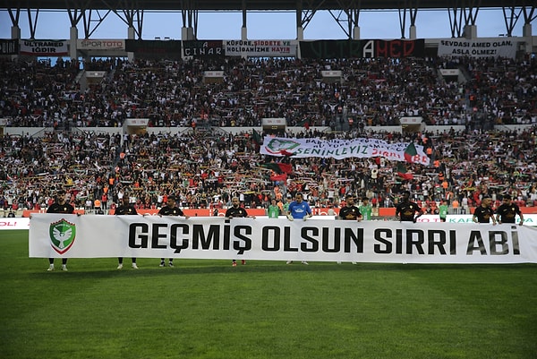 Amed Sportif maç seremonisine ‘Geçmiş Olsun Sırrı Abi’ pankartıyla çıktı. Bu esnada tribünlerde de ‘Seninleyiz Sırrı Abe’ pankartının açıldığı görüldü.