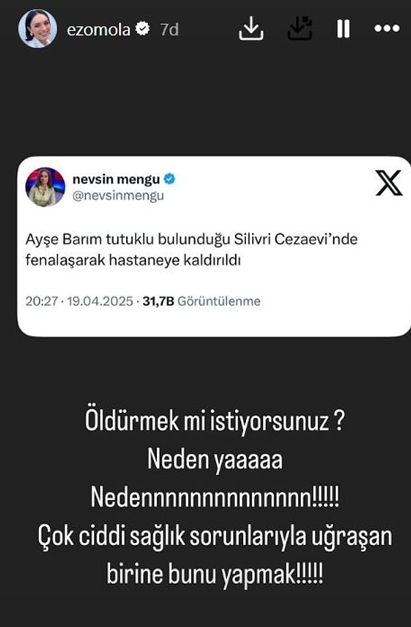 Nevşin Mengü, cezaevindeki Ayşe Barım’ın kötüleşerek hastaneye kaldırıldığını açıkladı, lakin kelam konusu gelişme hakkında şimdi net bilgiler yok. Ayşe Barım’ın arkadaşı Ezgi Mola, sıhhat meseleleri yaşayan Ayşe Barım için isyan etti.
