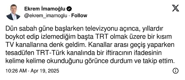 ‘Dün sabah güne başlarken televizyonu açınca, yıllardır boykot edip izlemediğim başta TRT olmak üzere bir kısım TV kanallarına denk geldim. Kanallar ortası geçiş yaparken tesadüfen TRT-Türk kanalında bir iftiracının tabirinin söz kelime okunduğunu görünce durdum ve takip ettim.