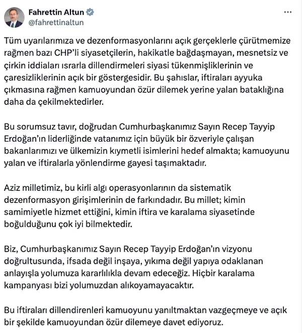 Bu savlara ve yayanlara İletişim Başkanı Fahrettin Altun’dan çok sert reaksiyon geldi.