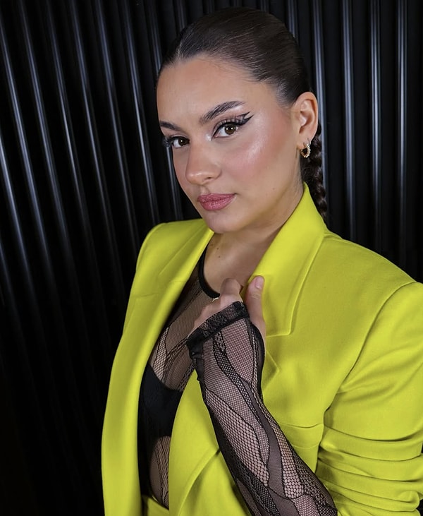 Büyük gözleri ve çarpıcı yüz çizgileriyle aslında Yeşilçam yıldızına benzettiğimiz Şekerci, bu makyajla adeta vakit seyahatine çıkmış üzereydi.
