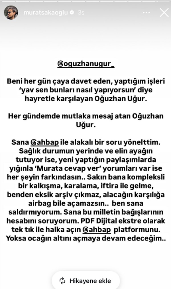 Oğuzhan Uğur cephesinden kısa müddette açıklama geldi. “Yani işin özü, bağışları ahbap ve AFAD topladı. Muhatabın Ahbap ve AFAD kardeşim.” sözlerine yer verdi.