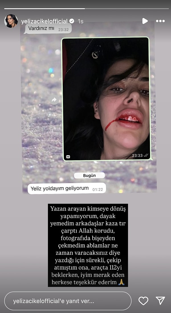 YouTube’da “Aşkın Gücü” ismiyle tekrar yayınlanan Kısmetse Olur yarışında dikkatleri üzerine çeken Yeliz Açıkel, bu kere toplumsal medya paylaşımıyla gündeme bomba üzere düştü. Geçirdiği trafik kazası sonrası yüzü kanlar içinde kalan Yeliz, yaşadıklarını takipçileriyle paylaştı.