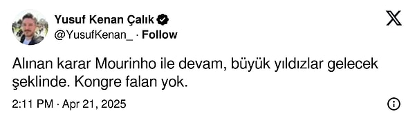 Ekol TV ekranlarında yorumculuk yapan Fenerbahçeli eski spiker Yusuf Kenan Çalık, toplumsal medya hesabından ‘Alınan karar Mourinho ile devam, büyük yıldızlar gelecek formunda. Kongre falan yok.’ paylaşımında bulundu.