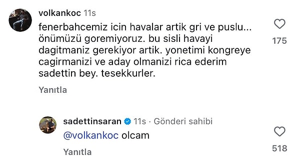 Instagram’da ‘volkankoc’ isimli bir kullanıcının ‘Yönetimi kongreye çağırmanızı ve aday olmanızı rica ederim Sadettin Bey’ yorumuna Saran, aday olacağını açıklayarak cevap verdi.