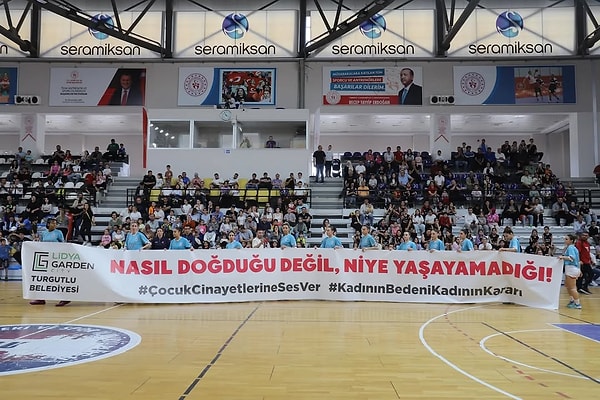 Lidya Garden City Turgutlu Belediyespor ile Kırklareli Belediyesi Kırklareli Fen Bilimleri ile oynadığı müsabaka öncesinde, mesken sahibi ekip ‘Nasıl doğduğu değil, niçin yaşayamadığı!.. Çocuk cinayetlerine ses ver – bayanın vücudu bayanın kararı” yazılı pankartla maça çıktı.