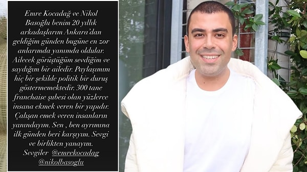 “Bu paylaşım politik bir bildiri taşımıyor. Nikol Basoğlu ve Emre Kocadağ benim 20 yıllık arkadaşlarım. Ailecek görüştüğüm, paha verdiğim beşerler. 300 tane franchaise şubesi olan yüzlerce beşere ekmek veren bir yapı. Çalışan ve emek veren insanların yanındayım.” diyerek tenkitlere karşı durmaya çalıştı.