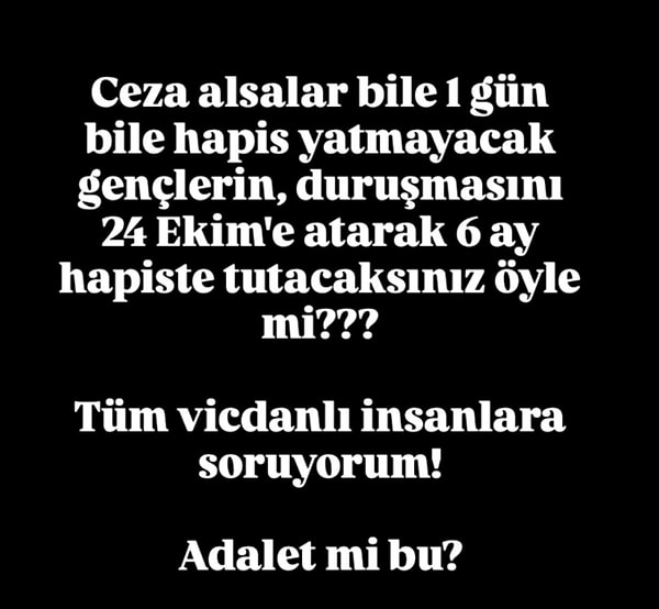 ‘Ceza alsalar bile 1 gün bile mahpus yatmayacak gençlerin, duruşmasını 24 Ekim’e atarak 6 ay mahpusta tutacaksınız o denli mi??? Tüm vicdanlı insanlara soruyorum! Adalet mi bu?’