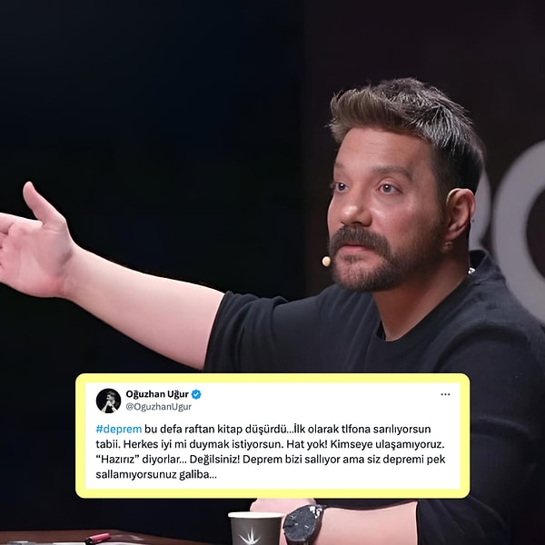 Oğuzhan Uğur’un 2019’da attığı tweet’te ‘#deprem bu sefer raftan kitap düşürdü…İlk olarak tlfona sarılıyorsun natürel. Herkes güzel mi duymak istiyorsun. Sınır yok! Kimseye ulaşamıyoruz. “Hazırız” diyorlar… Değilsiniz! Zelzele bizi sallıyor lakin siz zelzelesi pek sallamıyorsunuz galiba…’ sözleri yer alıyordu.