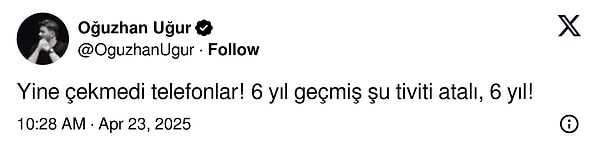 ‘Yine çekmedi telefonlar! 6 yıl geçmiş şu tweet’i atalı, 6 yıl!’ diyerek reaksiyon gösterdi.